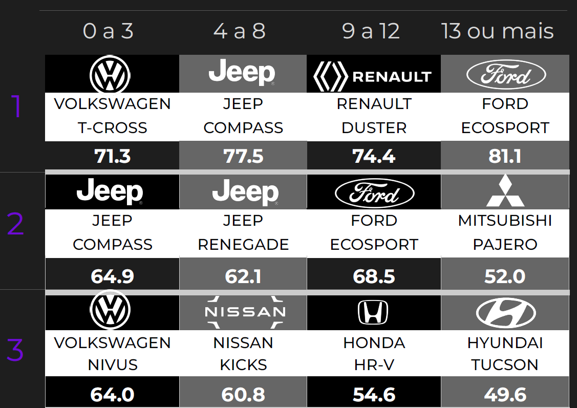 Já nas faixas de 9 a 12 anos e de 13 anos ou mais, lidera o Renault Duster, com 74,4 pontos, e o Ford EcoSport, com 81,1 pontos, respectivamente.