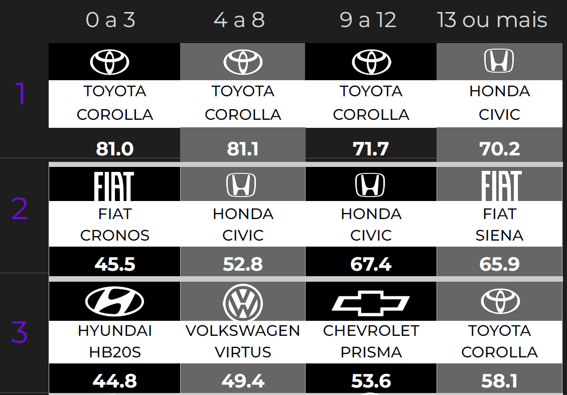 No segmento de sedãs, o Toyota Corolla confirma seu domínio absoluto, com 81 pontos, sendo o modelo com melhor desempenho nas faixas de 0 a 3 anos. Também lidera os de 4 a 8 anos (81,1 pontos) e de 9 a 12 anos, com 71,7 pontos.