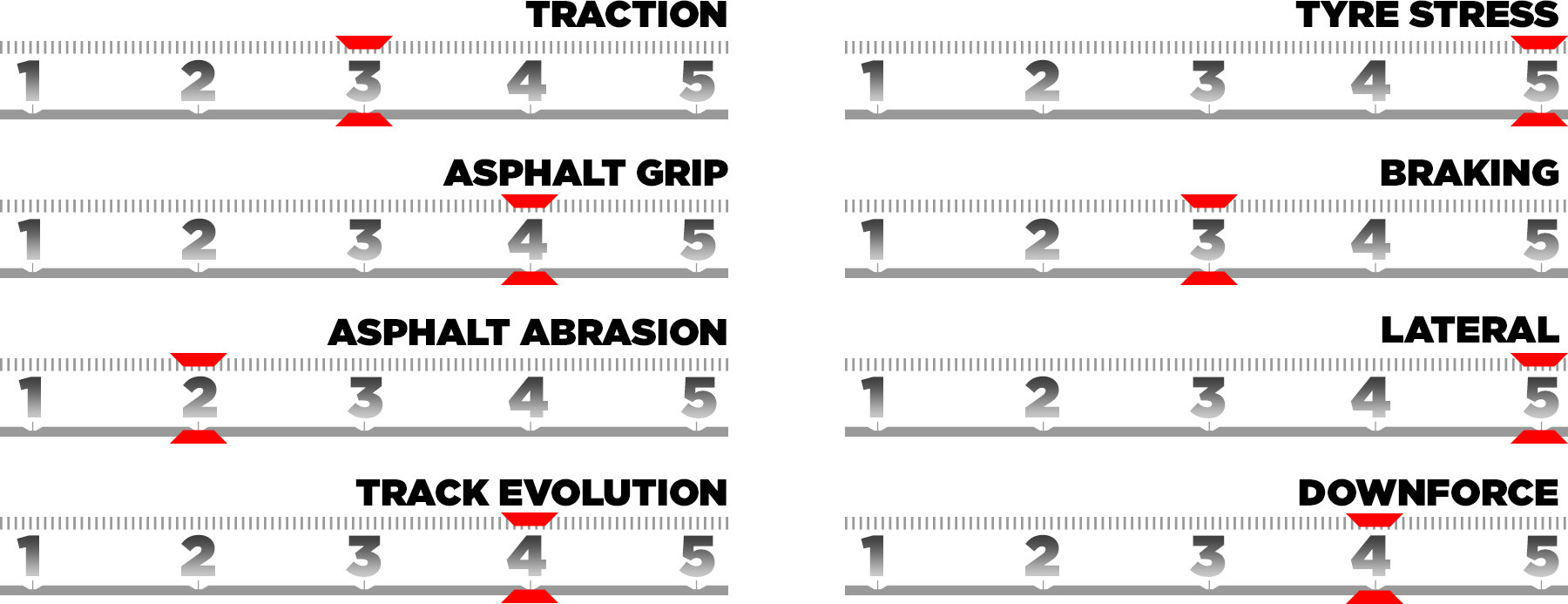 A maior parte das curvas da pista de Lusail são de alta velocidade, o que significa que os pneus têm pouco tempo para se recuperar, e o trecho que mais os desgasta é entre as curvas 12 e 14. A superfície da pista, que é bastante lisa, costuma causar granulação, o que contribui para um alto índice de desgaste dos pneus.