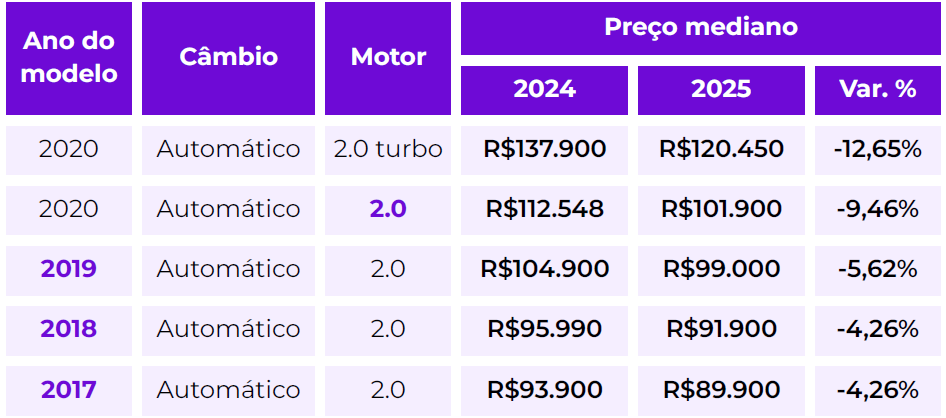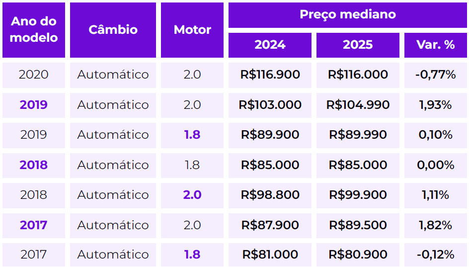 O Corolla 2020, com câmbio automático e motor 2.0, registrou a maior redução de preço dentre as versões deste sedã, de 0,77%. Já o melhor desempenho é do modelo do ano anterior, versão automática e motorização 2.0, com 1,93% de valorização.