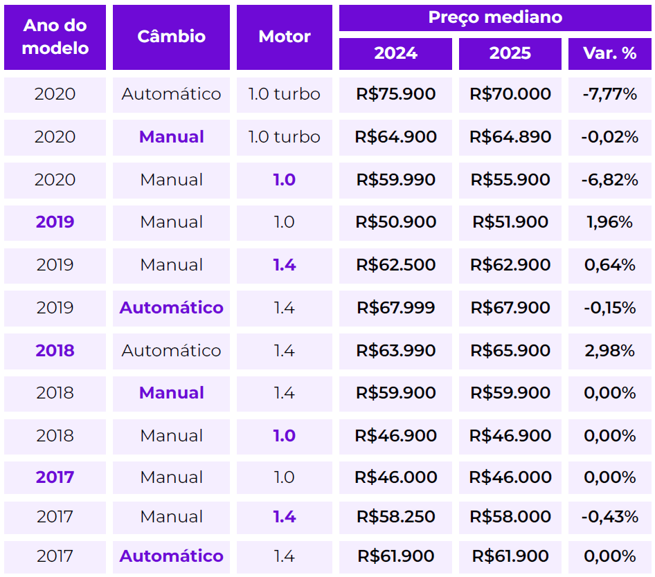 Na outra ponta, o Nissan Kicks 2018, com câmbio manual e motor 1.6, foi o carro que registrou o maior aumento de preço no mesmo período de comparação, dentre todos os avaliados. O SUV, que em agosto de 2024 era cotado no valor mediano de R$ 70.000, passou a valer R$ 74.450 doze meses depois, com alta de 6,36%.