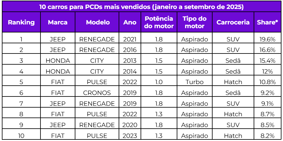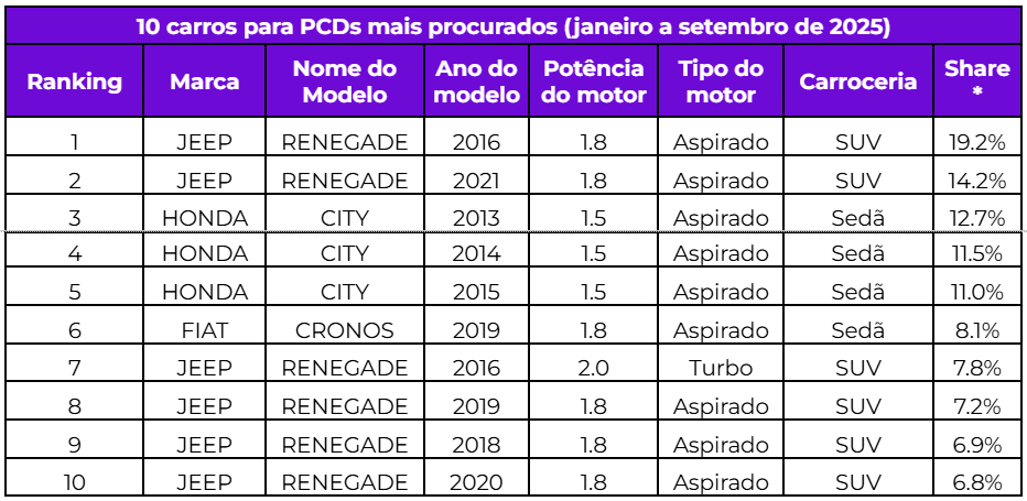 Novembro de 2025 – O Jeep Renegade 2021 é o campeão de vendas por meio da OLX dentre os automóveis indicados para PCDs, entre janeiro e setembro. O levantamento do Data OLX Autos, fonte de inteligência do Grupo OLX, mostra que o modelo, com motor 1.8 aspirado, representa 19,6% de participação dentre os avaliados. A versão 2016 ocupa o segundo lugar, com 16,6% das vendas. O Honda City 2013 motor 1.5 vem em terceiro, com 15,4%.