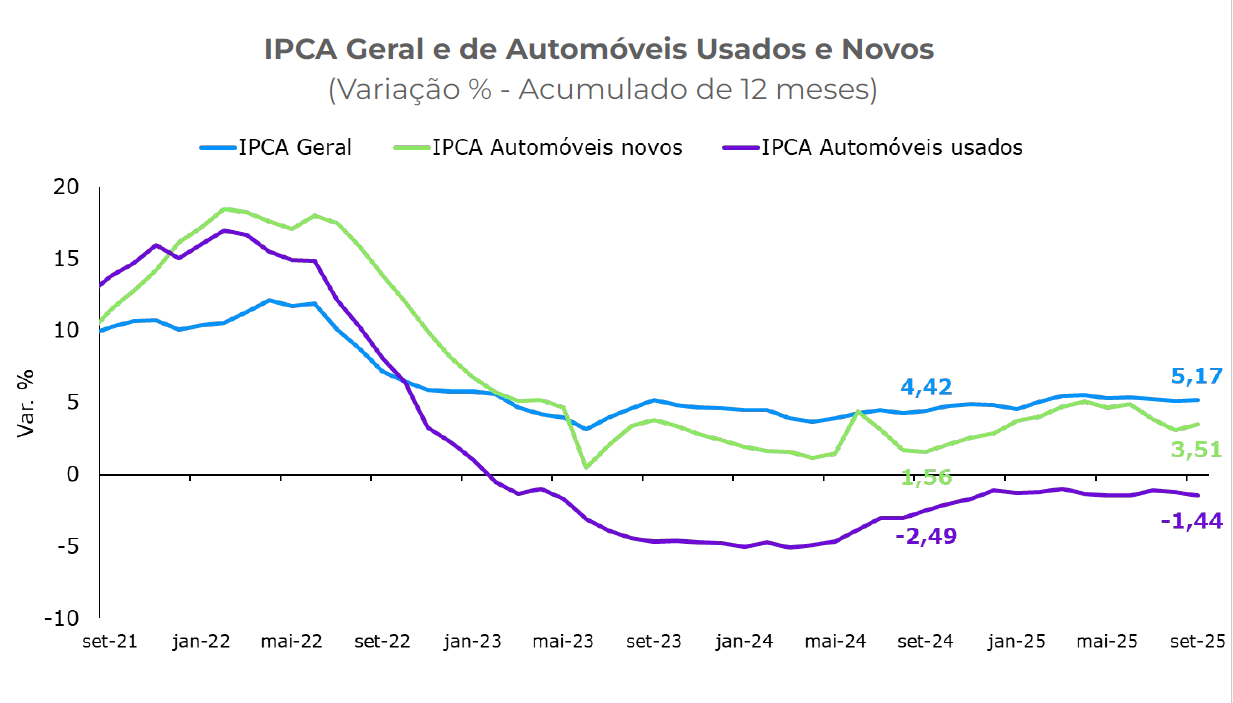 Em setembro, a inflação medida pelo IPCA desacelerou em relação a junho. No setor automotivo, o Programa Carro Sustentável influenciou na queda da inflação de veículos novos. Já a inflação de carros usados permaneceu relativamente estável, com 1,44% em setembro.
