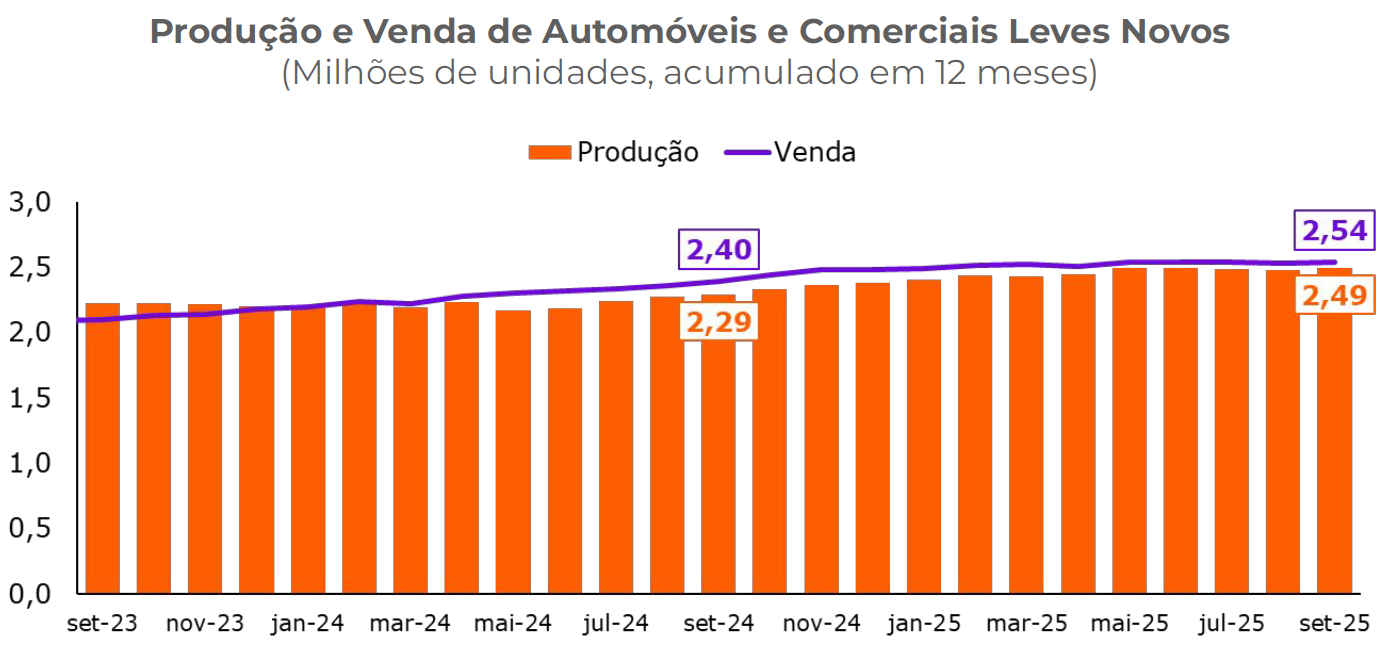 Os financiamentos de automóveis e comerciais leves concedidos de janeiro a setembro de 2025 caíram 2,1% em comparação ao mesmo período de 2024. Por outro lado, os financiamentos de veículos novos subiram 2,7%, enquanto os de veículos usados caíram 3,2%.