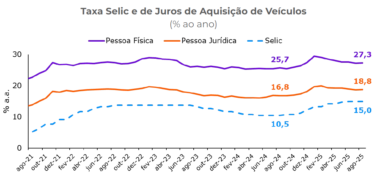 Os juros para financiamento de veículos se encontram em patamares superiores ao do ano passado, apesar de quedas recentes nas taxas para pessoas físicas e jurídicas. Isto se relaciona principalmente ao valor da Selic, em 15% desde setembro de 2024.