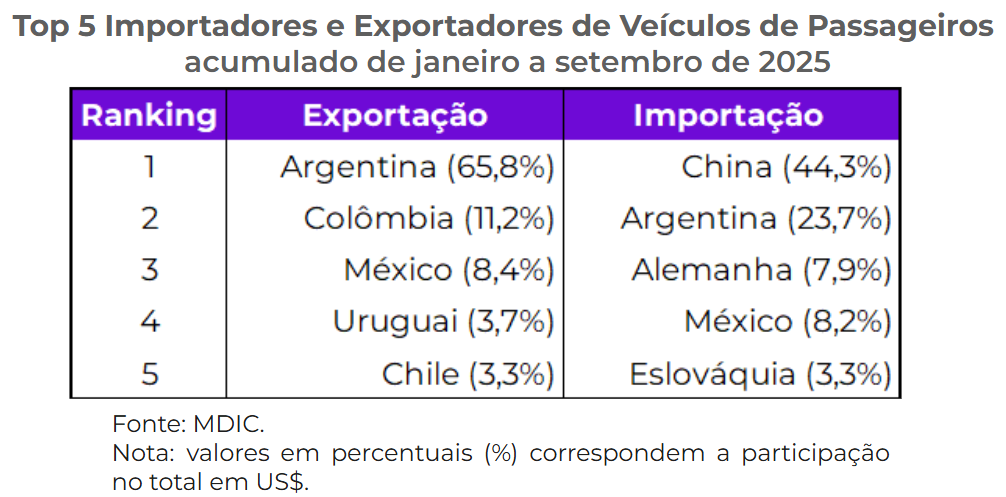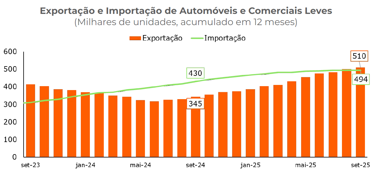 Segundo o estudo, após um ano e meio de saldos negativos no comércio de veículos de passageiros com outros países, voltamos a ter superávit no resultado acumulado em 12 meses em agosto e setembro deste ano. A principal explicação para a reversão do déficit é o elevado crescimento das vendas para a Argentina.