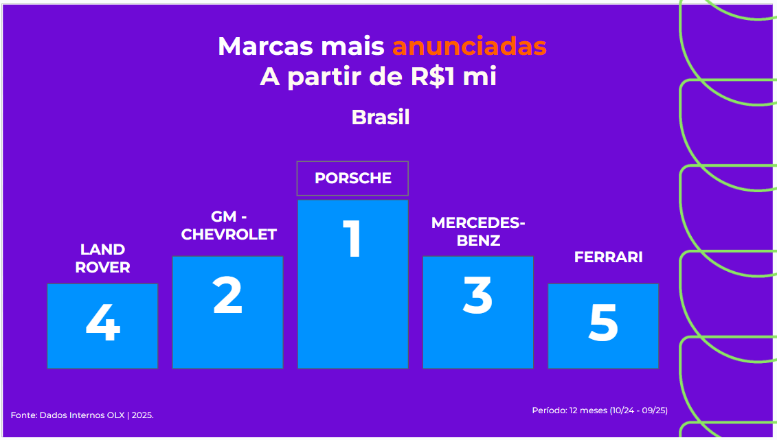 A Porsche é a marca automotiva que possui mais carros anunciados na plataforma a partir de R$ 1 milhão. A Chevrolet vem na segunda posição, seguida pela Mercedes-Benz.