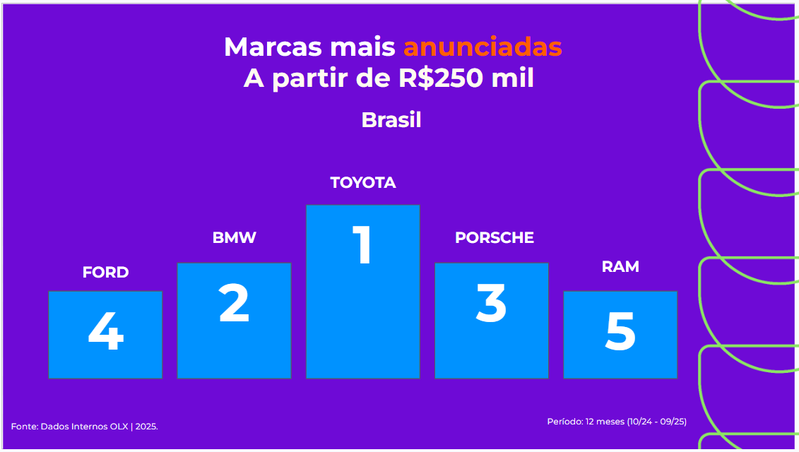 A Toyota lidera dentre as marcas mais anunciadas a partir de 250 mil, seguida pela BMW e Porsche, respectivamente.