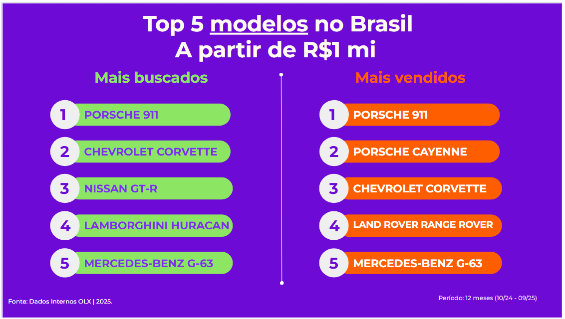 Dezembro de 2025 – Levantamento do Data OLX Autos, fonte de inteligência automotiva do Grupo OLX, mostra que o Porsche 911 é o mais vendido por meio da plataforma, na categoria de automóveis de luxo com valor superior a R$ 1 milhão. O estudo avaliou o desempenho dos modelos premium nos últimos doze meses, até setembro. O Porsche Cayenne ocupa a segunda posição, seguido pelo Chevrolet Corvette.