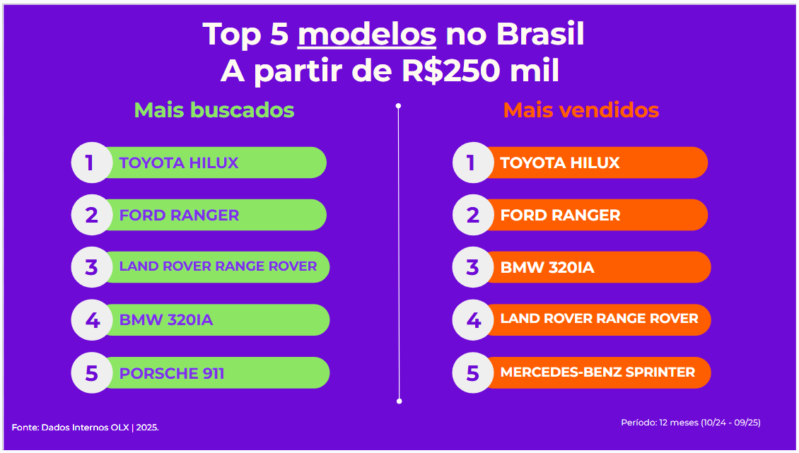 "É interessante observar que o Porsche 911, um ícone atemporal, mantém sua liderança tanto em vendas quanto em procura no segmento ultra-premium. Já na faixa de R$ 250 mil, vemos o domínio das picapes com o Hilux e Ranger ocupando as duas primeiras posições, refletindo a preferência brasileira por veículos versáteis e robustos", afirma Flávio Passos, VP de Autos do Grupo OLX. "Com um portfólio de mais de 800 mil veículos, a OLX reúne opções para todos os estilos, desde quem sonha com o primeiro modelo premium até quem já tem paixão por alto desempenho", complementa.