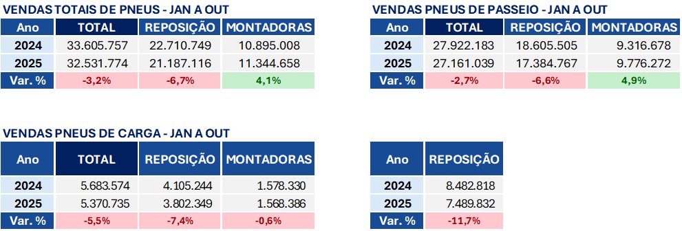 São Paulo, 28 de novembro de 2025 – As vendas totais de pneus no mercado brasileiro em outubro registraram queda de 7,4% frente ao mesmo mês do ano anterior, com 3,4 milhões de unidades comercializadas (saldo negativo de mais de 280.000 unidades). No acumulado do ano, foram vendidas 33,5 milhões de unidades, um recuo de 3,2% frente ao mesmo período do ano anterior, consolidando, uma redução de mais de 1 milhão de pneus. O desempenho foi impactado principalmente pela contração de 6,7% no mercado de reposição.